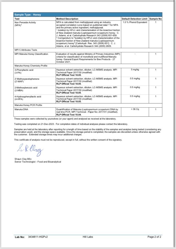 عسل المانوكا يحتوى على MG الذي يأتي من تحويل مركب آخر يسمى ثنائي هيدروكسي أسيتون،و التي وجدت منه تركيزات عالية في رحيق أزهار المانوكا ، ويعتقد ان MG هو المسؤل عن إعطاء عسل المانوكا قوتة المضادة للبكتيريا ، وارتفاع تركيز MG ، وقوة تأثيرة كمضاد حيوي هوالذي يحدد فوائد العسل الحقيقية .